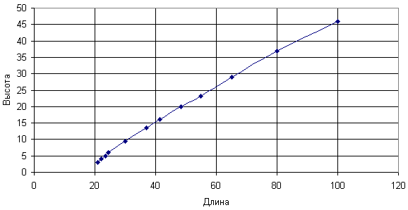 Рис. 1. Зависимость высоты от длины верёвки (расстояние между концами 100).