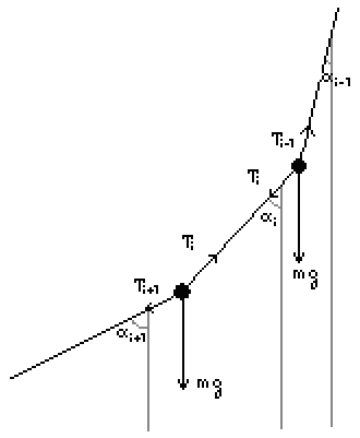 верёвка находилась в равновесии, в каждом i-ом узле должны выполняться