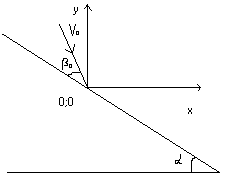 Пусть для начала нет ни трения, ни сопротивления воздуха; удар абсолютно упругий. Даны: угол наклона плоскости a, ускорение свободного падения g, скорость шарика V0 и угол его падения на плоскость b0. Возьмём систему координат с центром в точке падения шарика, оси координат направлены по x и по y соответственно вправо и вверх. Найти нужно скорость V1 и угол падения b1 шарика во время следующих ударов о плоскость, а также L1 - расстояние между точками ударов.
